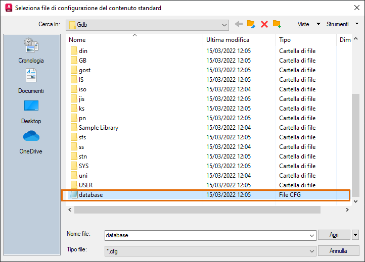 Selezionare il pulsante Sfoglia per il campo "File di configurazione del contenuto standard". Questo percorso fa riferimento al file di configurazione (file database.cfg) all'interno della cartella Gdb.