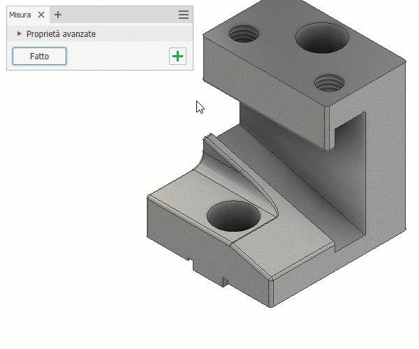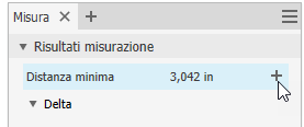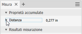 Per aggiungere una misurazione lineare, dell'area, del volume, della massa e/o dell'angolo alla sezione Proprietà accumulate: effettuare una selezione nella finestra grafica, quindi fare clic sul segno più accanto al tipo di misurazione. Ad esempio, selezionare una linea nella finestra grafica, quindi fare clic sul segno più accanto alla misurazione. Il valore viene aggiunto al gruppo di misurazione Distanza sotto Proprietà accumulate.