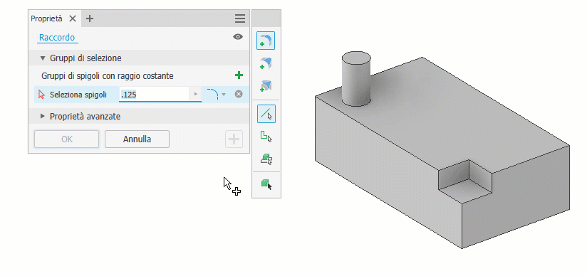 Nel gruppo Proprietà, posizionare il cursore su uno dei gruppi di selezione per visualizzare gli spigoli interessati evidenziati. Regolare l'impostazione del raggio in base alle esigenze. Per eseguire solo arrotondamenti o raccordi, è possibile deselezionare uno dei gruppi di selezione.
