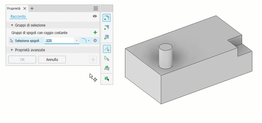 Il comando Raccordo semplifica l'applicazione di raccordi e arrotondamenti di raggi e condizioni variabili come un'unica lavorazione. Il gruppo Proprietà fornisce tipi di raccordo, modalità di selezione e gruppi di selezione per ottenere un'operazione di raccordo affidabile. Per ogni tipo di raccordo è possibile avere più gruppi di selezione di dimensioni diverse.