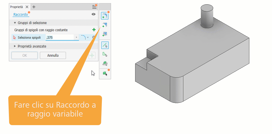 Selezionare uno o più spigoli e specificare un raggio diverso per il punto iniziale e il punto finale di ciascuno spigolo. È possibile aggiungere punti intermedi, ognuno dei quali può avere un raggio e una posizione differenti lungo lo spigolo. Infine, selezionare il tipo di continuità dello spigolo.