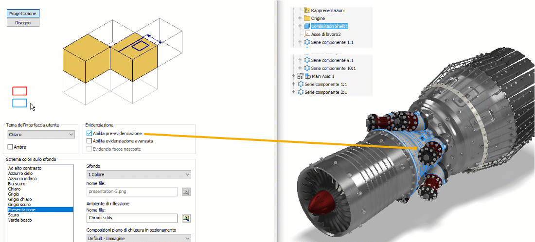 Consente la pre-evidenziazione o l'evidenziazione dei componenti dell'assieme attraverso altri componenti. L'evidenziazione viene visualizzata quando si evidenzia o si seleziona un componente o un vincolo.
