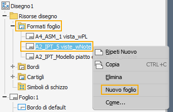 Nel browser, espandere Risorse disegno Formati foglio. Fare clic con il pulsante destro del mouse su un formato di foglio e selezionare Nuovo foglio.