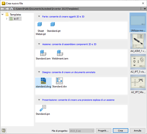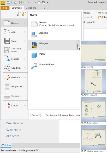 Nell'icona a comparsa Nuovo, posizionare il cursore su Disegno per visualizzare le opzioni relative al modello e al formato foglio.