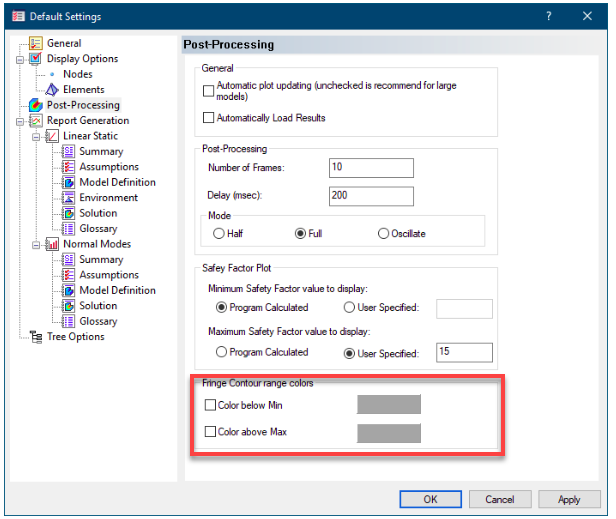 Per impostare i colori per gli elementi fuori intervallo, aprire le impostazioni di default, passare a Post-elaborazione e selezionare le caselle all'interno della sezione Colori intervallo contorno bande. Quando il tipo di contorno è impostato su Bande e sono stati impostati i valori minimi e massimi dell'intervallo, gli elementi fuori intervallo saranno visibili nel colore impostato.