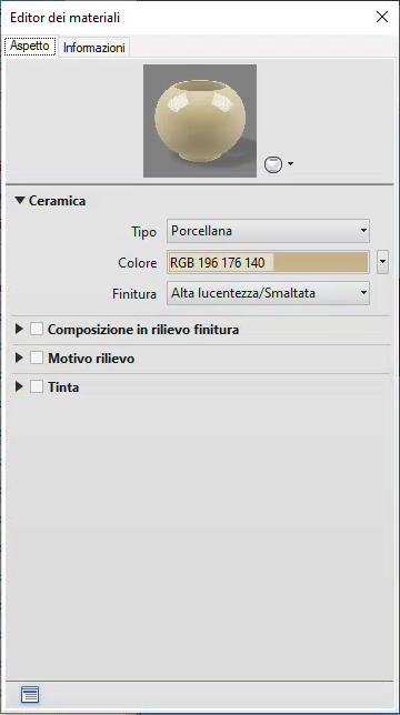 Nella scheda Aspetto, specificare le proprietà e le opzioni di colore del materiale.