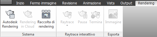 È possibile accedere agli strumenti di Autodesk Rendering dalla scheda Inizio > gruppo Strumenti e dalla scheda Rendering della barra multifunzione.