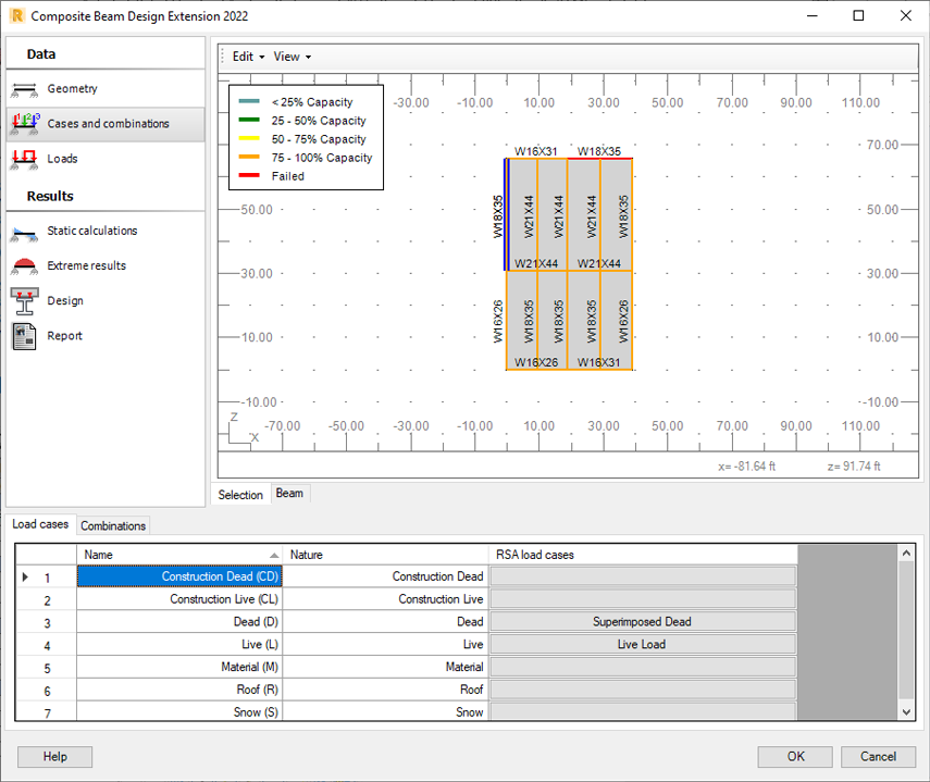 On the Load Cases tab, the extension automatically assigns simple load cases from the model to the load natures specified in the ANSI/AISC 360-10 code. If a load nature is not clear, the extension may be unable to assign a load case to it. You can assign load cases to a load nature manually then.