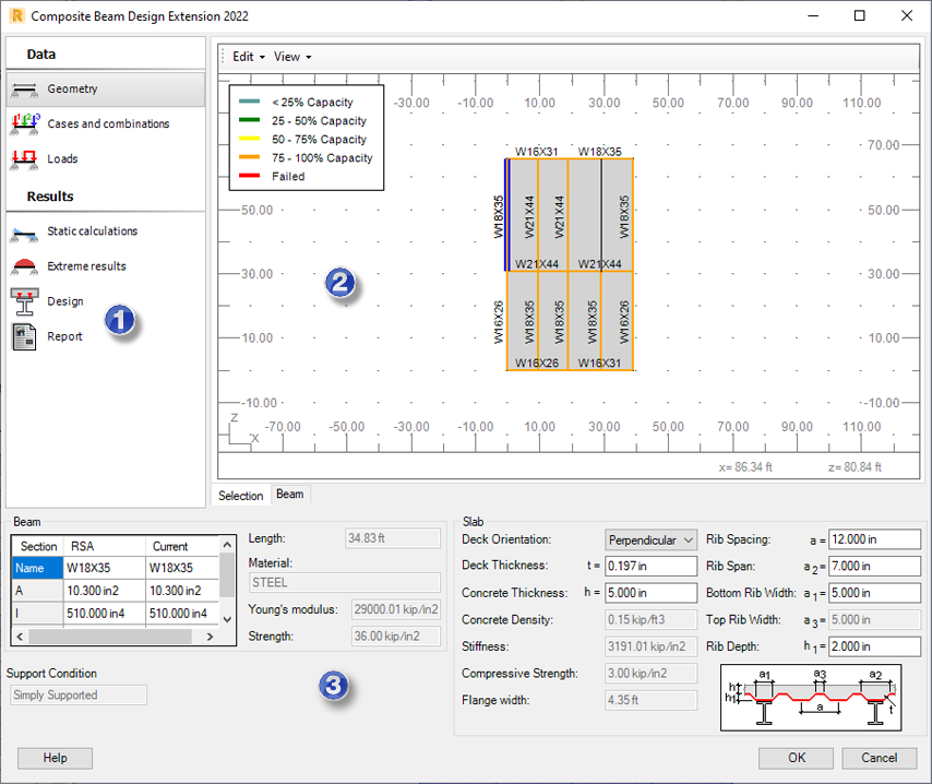 - The contents of tables depends on a tab. The tables let you review and adjust parameters and results for a beam selected in the graphic viewer. Here you can also select results to display on diagrams or specify report settings.