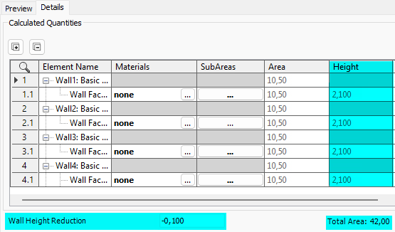 (Calculate Room Quantities) per aprire la finestra di dialogo Calculate Room Quantities. Selezionare un superficie del muro dalla struttura ad albero e trovare Wall Height Reduction in fondo alla finestra di dialogo.