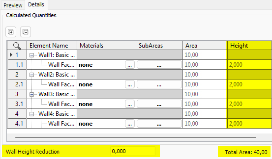 Nota: Questo strumento è disponibile solo per le superfici del muro. L'opzione Wall Height Reduction è disattivata per altre quantità dei locali.