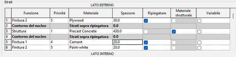 Gli strati sono assegnati ad una riga. Presentano uno spessore uniforme che si estende per l'intera altezza del muro. Lo spessore dello strato può essere modificato nella riga a cui è assegnato. È inoltre possibile assegnare un materiale ad ogni strato.