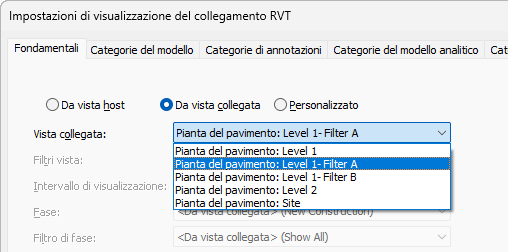 - Nella finestra di dialogo Impostazioni di visualizzazione del collegamento RVT, nella scheda Fondamentali, effettuare le seguenti operazioni: