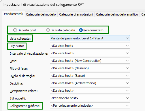 | Filtro vista | Disponibile solo per l'opzione Personalizzato. Specifica se il modello collegato viene visualizzato utilizzando il filtro applicato alla vista collegata o alla vista host. Non controlla la visualizzazione dei modelli nidificati. |
