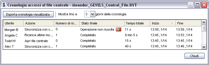 Nella finestra di dialogo Cronologia vengono visualizzate le informazioni su tutte le azioni che interessano il file centrale per il progetto Revit selezionato. Se un'operazione di accesso al file centrale non è andata a buon fine, fare clic su