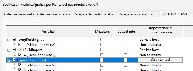 I parametri che controllano la visibilità e gli elementi grafici dei modelli Revit collegati sono raggruppati nella scheda Collegamenti Revit della finestra di dialogo Visibilità/Grafica.