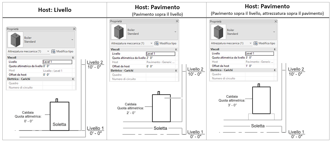 Nell'esempio riportato di seguito, il pavimento è 2' 0" sopra il livello. Quando la caldaia è posizionata sul pavimento, Quota altimetrica da livello = 2' 0" e Offset da host = 0' 0".