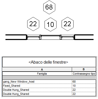 Per assegnare etichette e includere negli abachi sia i sottocomponenti finestra fissa sia i sottocomponenti finestra a saliscendi è stata creata la stessa famiglia finestra tripla, ma stavolta si utilizza come famiglia host una nuova famiglia di finestre e sia la finestra fissa, sia le finestre a saliscendi vengono caricate come finestre condivise. Da notare la differenza quanto ad etichettatura e inclusione nell'abaco.