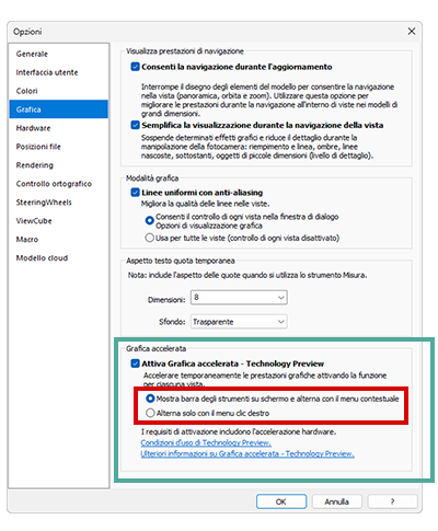 Per attivare o disattivare manualmente l'accesso a Grafica accelerata, accedere alla finestra di dialogo Opzioni