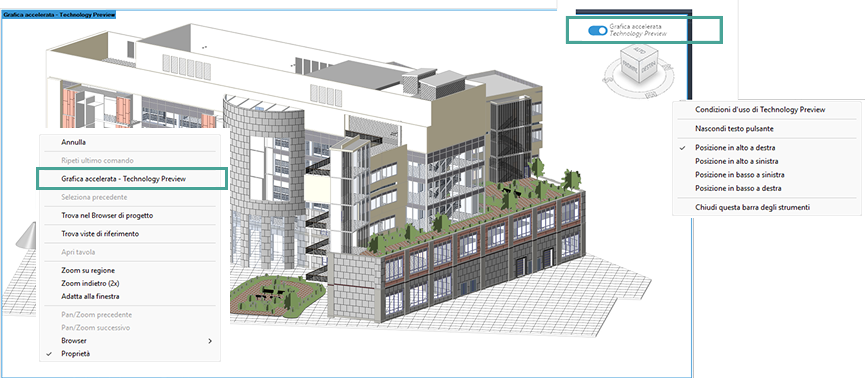 Grafica accelerata di Revit e selezionare Attiva Grafica accelerata - Technology Preview. Una volta attivata, utilizzare i pulsanti di opzione per attivare o disattivare la modalità di attivazione della grafica accelerata in Technology Preview nelle singole viste.