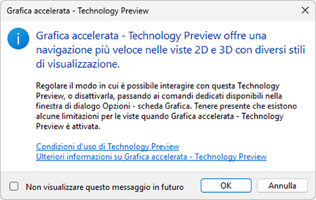 Grafica accelerata - Technology Preview è attivata per default. Questa opzione può essere disattivata dal file Revit.ini. Per ulteriori informazioni, vedere Impostazioni della sezione Graphics nel file Revit.ini.