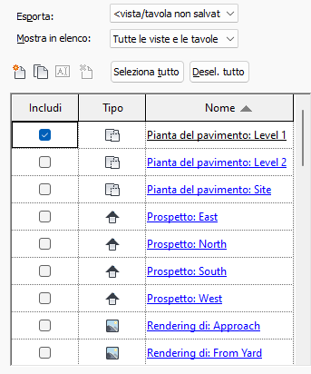 Durante l'esportazione di un modello in uno dei diversi formati, è possibile utilizzare gli strumenti disponibili nella finestra di dialogo Esporta per selezionare le viste e le tavole da includere. È possibile salvare il gruppo selezionato per riutilizzarlo in seguito.