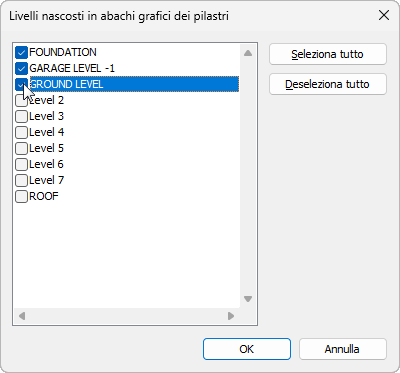 Nota: Per visualizzare un livello nell'abaco grafico dei pilastri, lasciare deselezionata la corrispondente casella di controllo. Inoltre, il livello deve rientrare nell'intervallo dei vincoli di livello superiore e inferiore definito per la vista abaco grafico dei pilastri corrente. Per ulteriori informazioni sui vincoli di base e di altezza, vedere