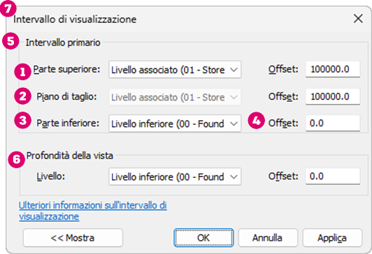 Eccezioni: per i pavimenti, i pavimenti strutturali, le scale e le rampe che non rientrano nell'intervallo di visualizzazione viene utilizzato un intervallo modificato posto 4 piedi (circa 1,22 metri) sotto la parte inferiore dell'intervallo primario. In tale intervallo modificato gli elementi vengono disegnati utilizzando lo spessore di linea di proiezione per la categoria. Se si trovano al di fuori dell'intervallo modificato ma all'interno della profondità della vista, tali elementi vengono disegnati con lo stile di linea <Oltre>.
