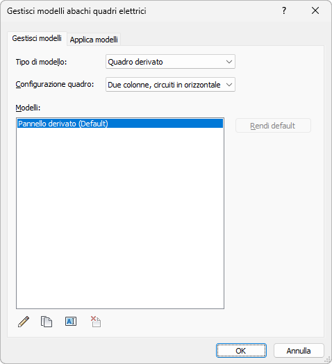 La finestra di dialogo Gestisci modelli abachi quadri elettrici consente di modificare, duplicare, eliminare e applicare modelli di abachi quadri elettrici, nonché di specificare il modello di default.