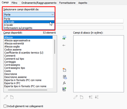 - Nella scheda Campi, dal menu a discesa Selezionare campi disponibili da, scegliere Da locale o A locale.