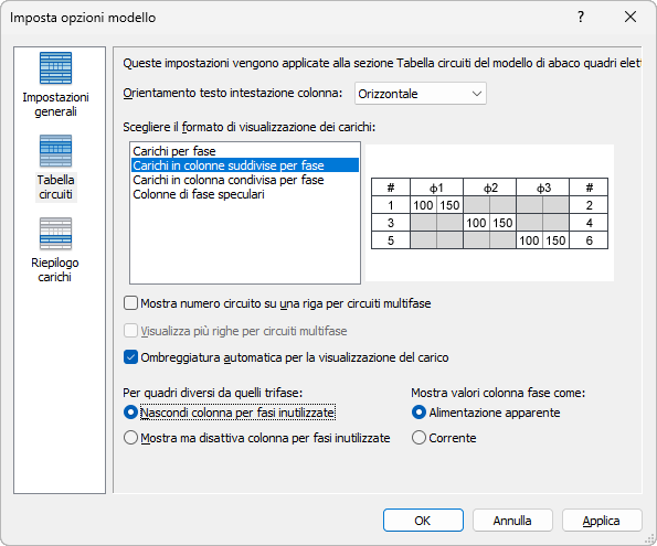 - Specificare se visualizzare più righe per i circuiti multifase.