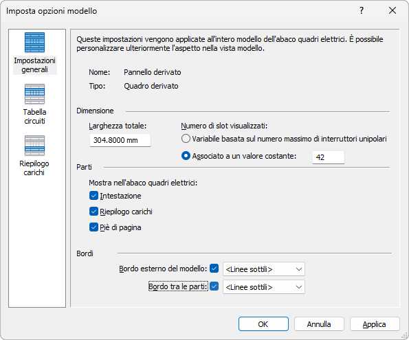 Le opzioni di Impostazioni generali consentono di personalizzare l'aspetto globale dell'abaco quadri elettrici, ad esempio larghezza, parti, bordi e numero di slot e parti visualizzati. È possibile modificare queste impostazioni prima o dopo la creazione di un abaco quadri elettrici per renderlo conforme alle specifiche.