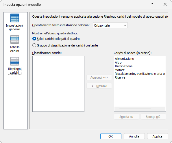 Consente di specificare quali classi di carico visualizzare negli abachi quadri elettrici e il relativo ordinamento.