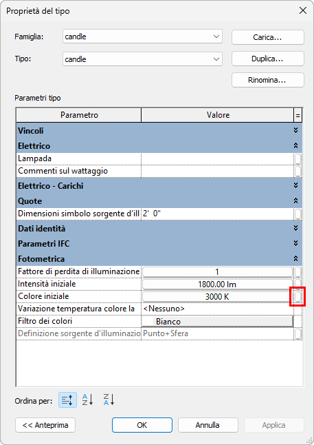 Nota: Questa famiglia verrà nidificata nella famiglia di lampadari host e molteplici istanze della stessa (ovvero molteplici candele) saranno posizionate nel lampadario. La famiglia rappresenta quindi una singola sorgente luminosa o candela.