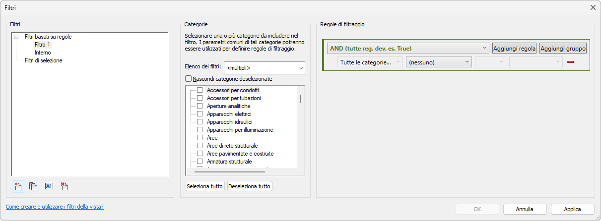 Dopo aver creato il filtro, applicarlo ad una o più viste per cambiare la visibilità e la visualizzazione grafica degli elementi identificati dal filtro.
