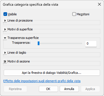 La finestra di dialogo Grafica categoria specifica della vista mostra le impostazioni di visibilità e visualizzazione grafica correnti per la categoria selezionata. Espandere ogni sezione per visualizzarne le impostazioni.