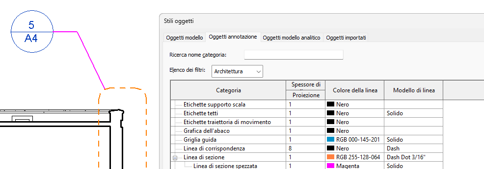 È possibile definire lo spessore, il colore e il modello di linea dei simboli circolari di dettaglio e delle linee direttrici. Queste impostazioni vengono applicate a tutti i dettagli contenuti nel progetto.