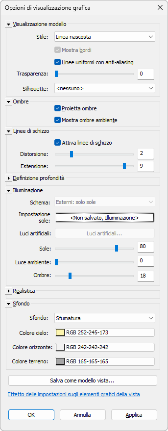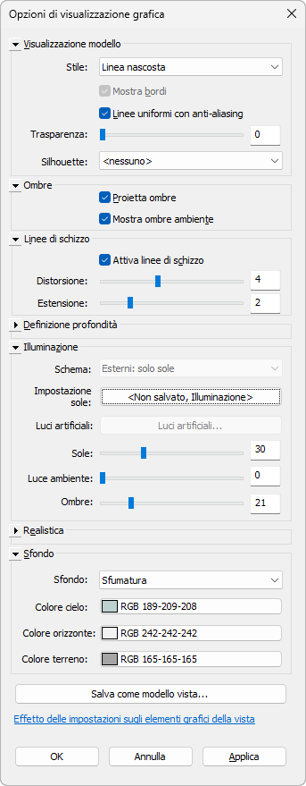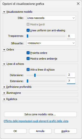 Nella finestra di dialogo Opzioni di visualizzazione grafica sono specificate le seguenti impostazioni per la vista: