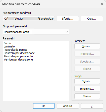 Ora i parametri condivisi devono essere aggiunti al progetto e assegnati alla categoria Locali. In questo modo il parametro viene visualizzato negli elementi del locale presenti nel modello, in modo da poter inserire i valori nei parametri.