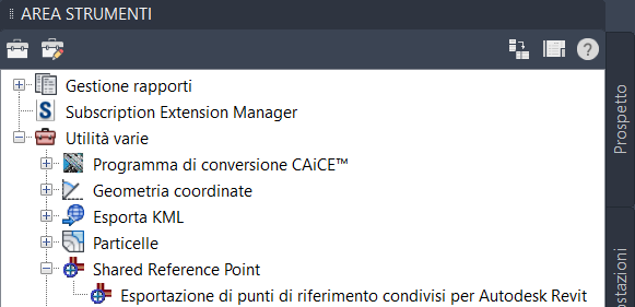 - Per utilizzare l'estensione Shared Reference Point, nel Riquadro degli strumenti di Civil 3D, selezionare prima Esporta punti di riferimento condivisi per Autodesk Revit.