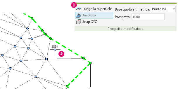 Quando si aggiungono punti durante la modifica della forma, utilizzare l'impostazione Base quota altimetrica per definire la quota altimetrica relativa del punto. È possibile scegliere di misurare le quote altimetriche dal livello corrente, dal punto base del progetto, dal punto rilevamento e dall'origine interna. È possibile determinare se aggiungere i punti ad una quota altimetrica assoluta dal riferimento selezionato o se eseguire l'offset di una distanza specificata dalla superficie esistente.