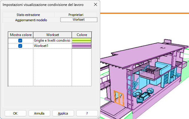I colori utilizzati per le modalità di visualizzazione della condivisione del lavoro sono controllati nella finestra di dialogo Impostazioni visualizzazione condivisione del lavoro.