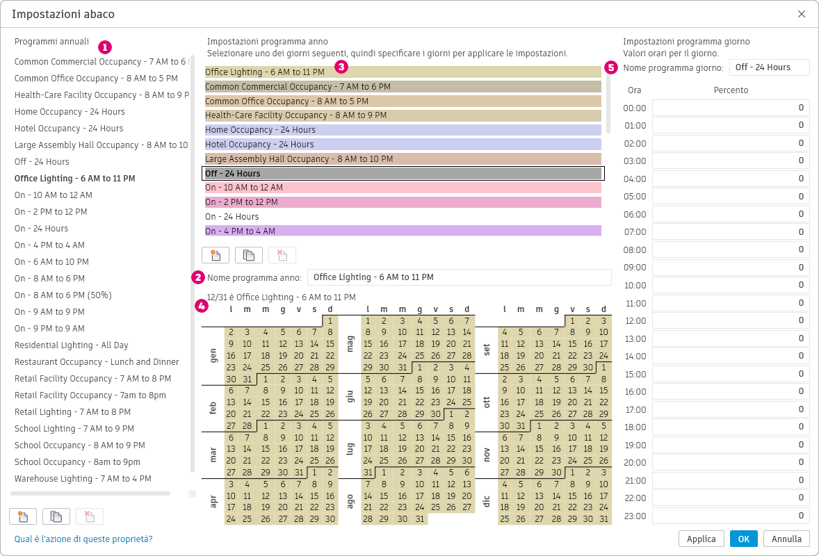 È possibile selezionare gli abachi occupazione, illuminazione e alimentazione per un tipo di edificio e singoli vani all'interno del modello.