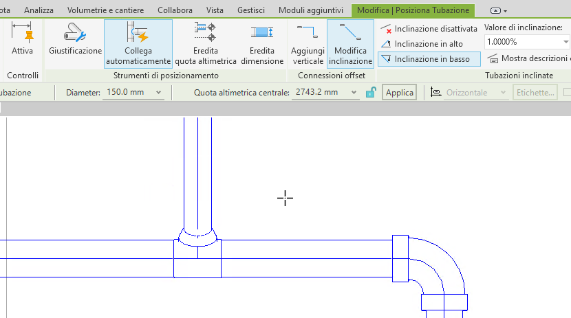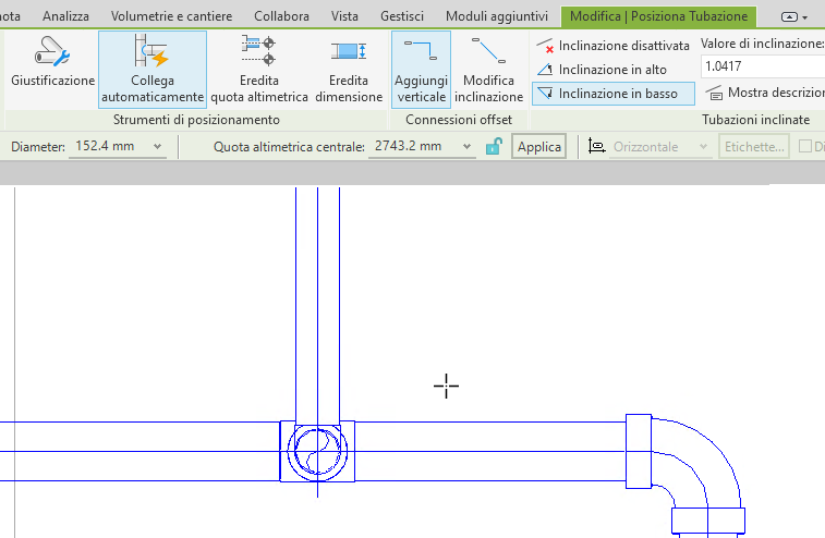 - Per eseguire la connessione diretta indipendentemente dal valore di inclinazione, nella barra multifunzione fare clic sulla scheda Modifica | Posiziona Tubazione