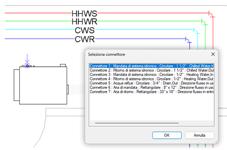 Se il nuovo componente può essere collegato a più di un sistema, viene visualizzata la finestra di dialogo Seleziona connettore. Ogni connettore di tubazioni viene elencato con il numero di indice, la classificazione di sistema, la forma, le dimensioni, la descrizione del connettore e la direzione del flusso. La descrizione del connettore può essere utilizzata per indicare il tipo di sistema da assegnare al connettore. Una freccia indica la posizione e la direzione del connettore selezionato.