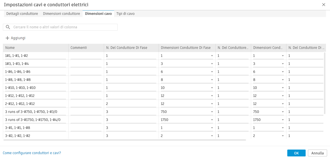 Utilizzare questa finestra di dialogo per specificare i parametri di cablaggio e cavo. Utilizzare i conduttori definiti nei circuiti nelle progettazioni elettriche del modello.