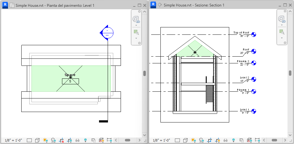 - Chiudere tutte le viste, ad eccezione della vista di sezione e della pianta del pavimento in cui si desidera posizionare il vano e digitare w t sulla tastiera per affiancare le 2 viste.