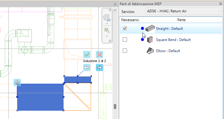 La tavolozza Parti di fabbricazione MEP consente di visualizzare tutte le parti utilizzate nelle soluzioni disponibili. Un punto blu indica che una parte viene utilizzata nella soluzione attualmente selezionata. Quando si posiziona il puntatore del mouse su una delle parti presenti nell'elenco, la parte viene evidenziata nell'area di disegno. Nella tavolozza Parti di fabbricazione MEP, selezionare le caselle di controllo per filtrare l'elenco dei raccordi disponibili e limitare il numero di soluzioni.