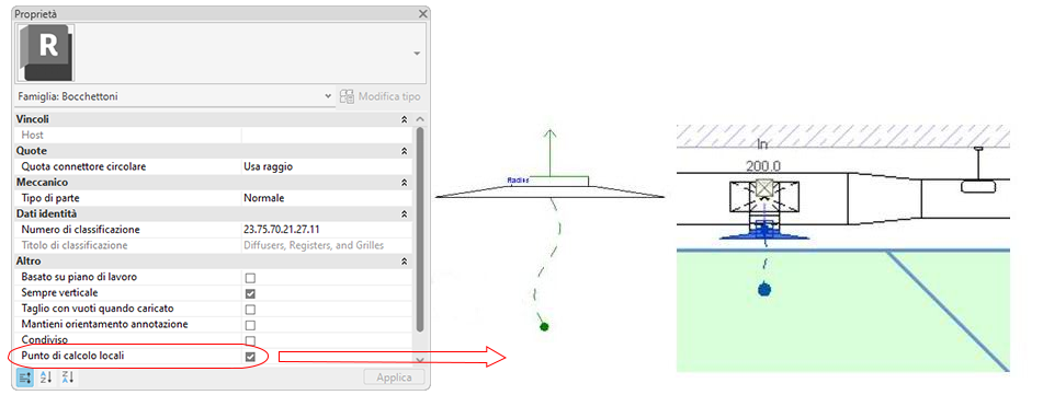 modificare la famiglia in modo che venga attivato il Punto di calcolo locali per il dispositivo di illuminazione, quindi spostare la posizione del punto di calcolo in modo che si trovi all'interno del vano. Nell'Editor di famiglie, nella tavolozza Proprietà, selezionare Punto di calcolo locali. Modificare la posizione del Punto di calcolo locali in modo che si trovi all'interno del vano.