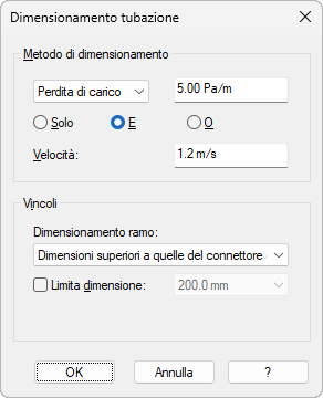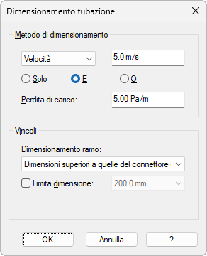 Le opzioni nella finestra di dialogo Dimensionamento tubazioni consentono di utilizzare ogni metodo da solo (selezionare Solo) o in combinazione con l'altro (selezionare E o O).